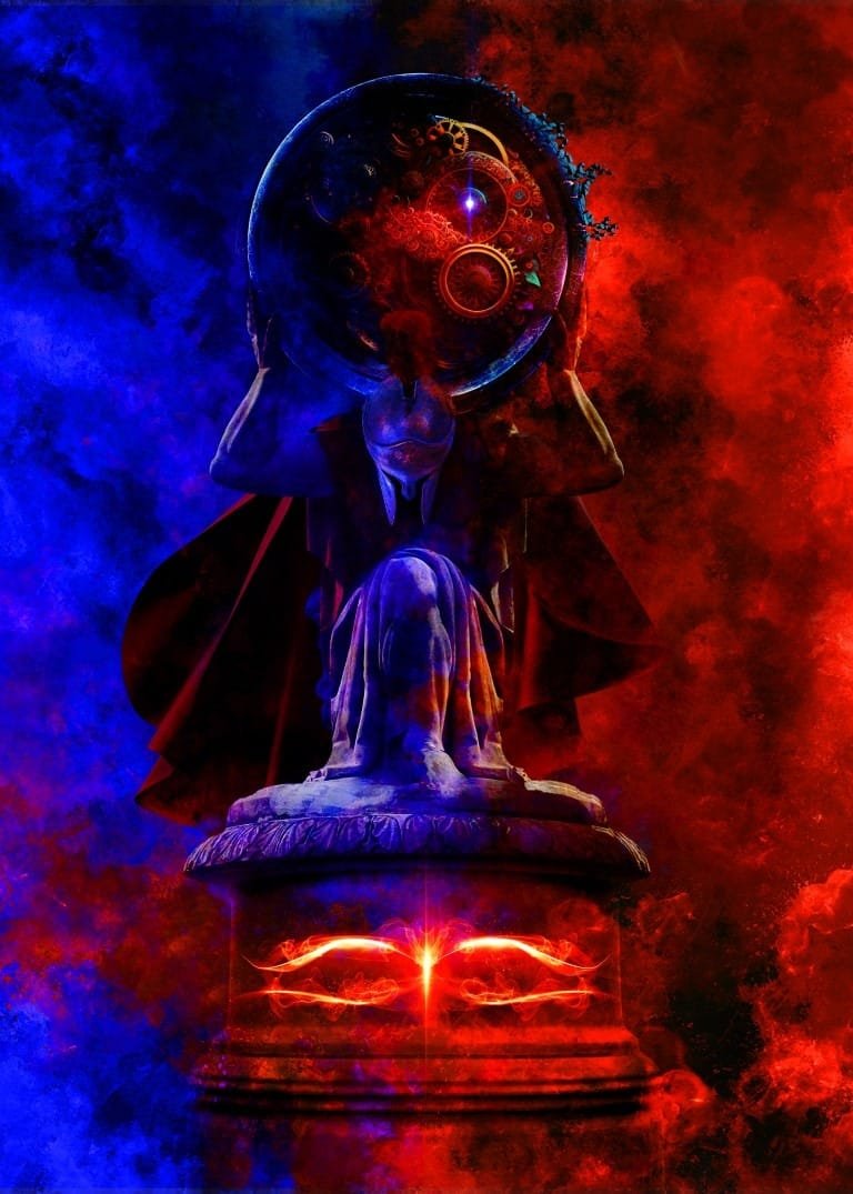 Ces couleurs chargées d’une forte symbolique, le rouge étant associé à la passion, la force et la colère, et le bleu à la sérénité, le calme et la contemplation, permettent d’exprimer une large palette d’émotions à travers mes œuvres.